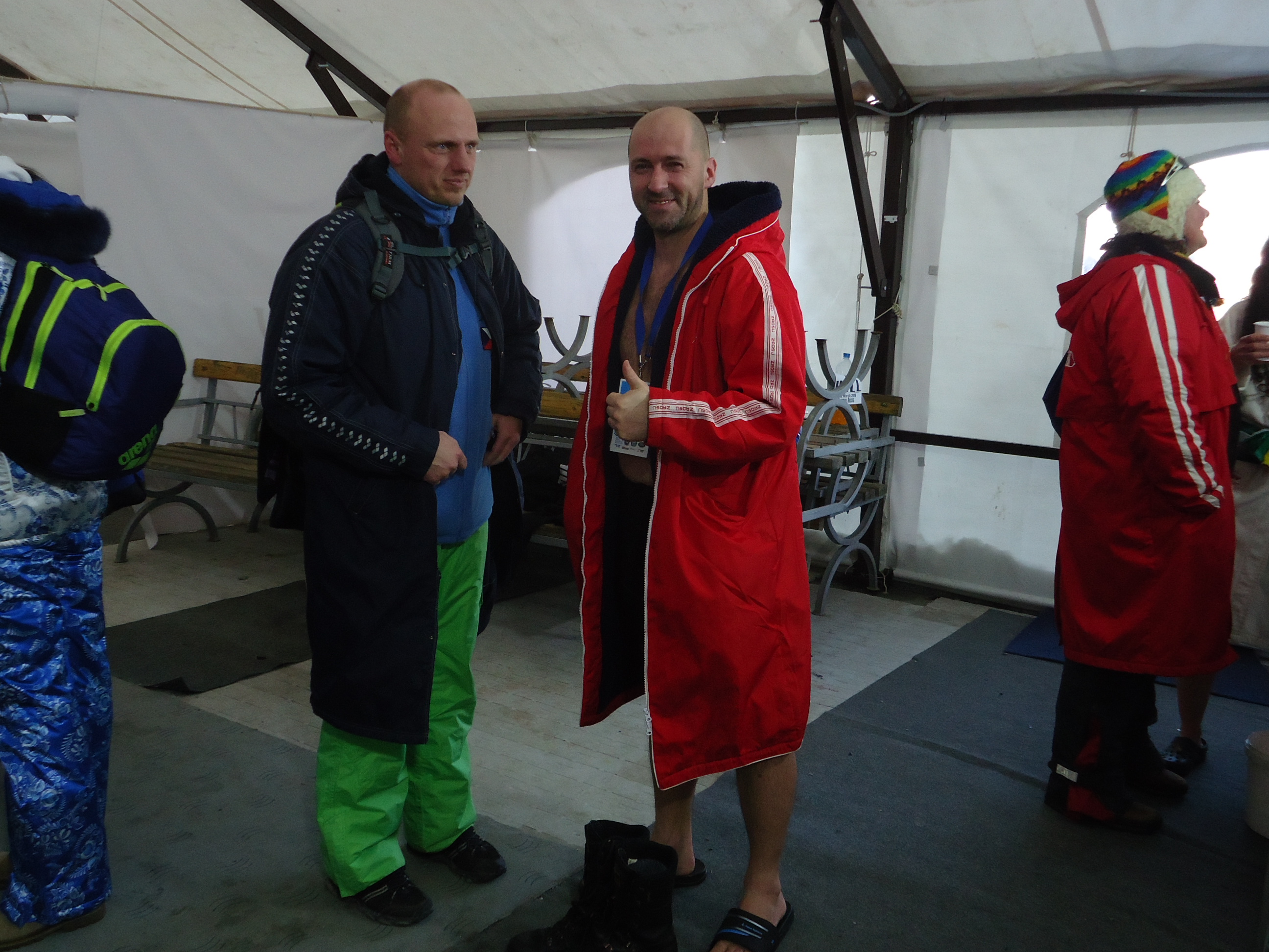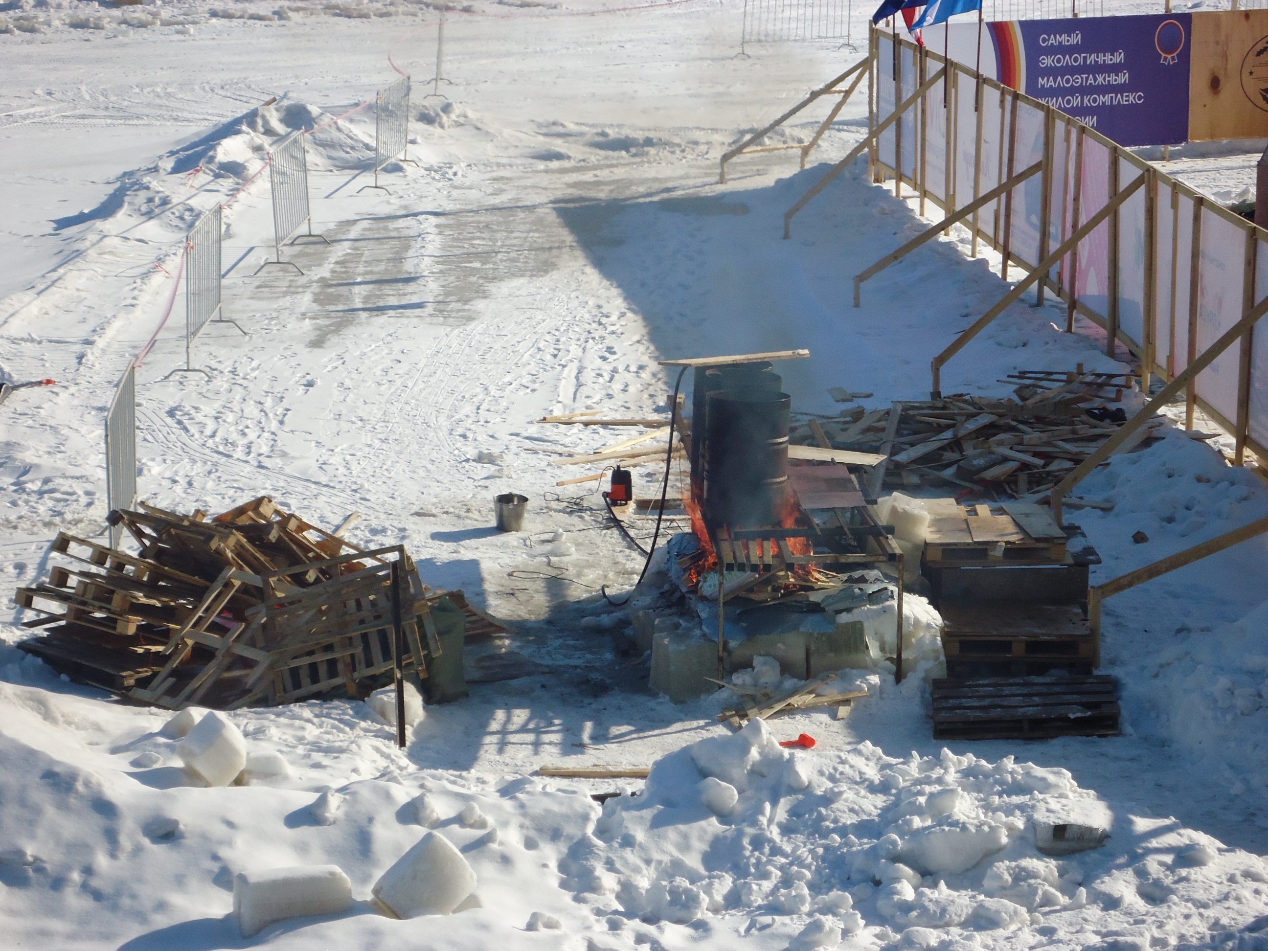 Ještě drobná příhoda k ohřevu vody. V sobotu ráno před závodem měli topiči vybudované velké ohniště. Nad ním byl na dvou kozách rošt z volně uložených šestimetrových ocelových profilů. Na nich stály barely připravené k ohřevu. Vysoká teplota ohně z dřevěných palet dokonala své. Ohřáté profily se prohnuly a plechové bečky s vodou se propadly do ohně a převrátily. Drobný technický problém vyřešili borci z Tyumenu posvém. Zohýbaná železa hodili bokem. Přímo na popel v ohništi postavily znovu barely s novou náplní ledu a sněhu. Proces výroby teplé vody začal znovu a úspěšně. Mokrý popel původního ohniště přímo na ledě řeky Tury fungoval jako dobrý izolant. Obava, že by se led žárem rozpustil, byla lichá. Zásobování saunového servisu teplou vodou fungovalo celý den. Mohu to potvrdit, protože jsem plaval až v T3 ve 13:30 hodin, v poslední rozplavbě na 450 m. Po doplavání jsem si vše užil také.