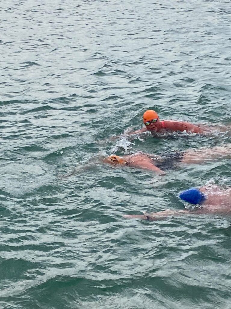 V pravé poledne odstartovala první rozplavba nejdelší distance, kde byli naši nejrychlejší kilometrovníci: Michal, Pavel, Eva a Danka. Tři minuty po nich následovala druhá rozplavba na kilometru s Ivonkou, Janou, Hankou, Jožkou a Andreou. Nelehké podmínky způsobené silným větrem byly docela znát. Výborný výkon podal Michal, který doplaval na prvním místě, stejně tak osmý Pavel, Jožka uzavíral druhou desítku. Nejrychlejší z děvčat byla Danuška na 5. místě následována šestou Evou. Pak už holky doplavávaly kolegiálně ve dvojicích s minimálními časovými rozestupy – Jana s Ivonkou na 8. a 9. místě, vzadu to jistila Andrea s Hankou na 12. a 13. místě.